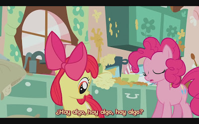 Con respecto a las tonterías que dicen Diamond Tiara y Silver Spoon, lo que dicen es "Bump! Bump! Sugar-lump, rump!". No le encontré mucho sentido (supongo que ponen esas palabras porque suenan parecido), y no me gusta inventarme demasiadas cosas, así que sin subtitular se queda.